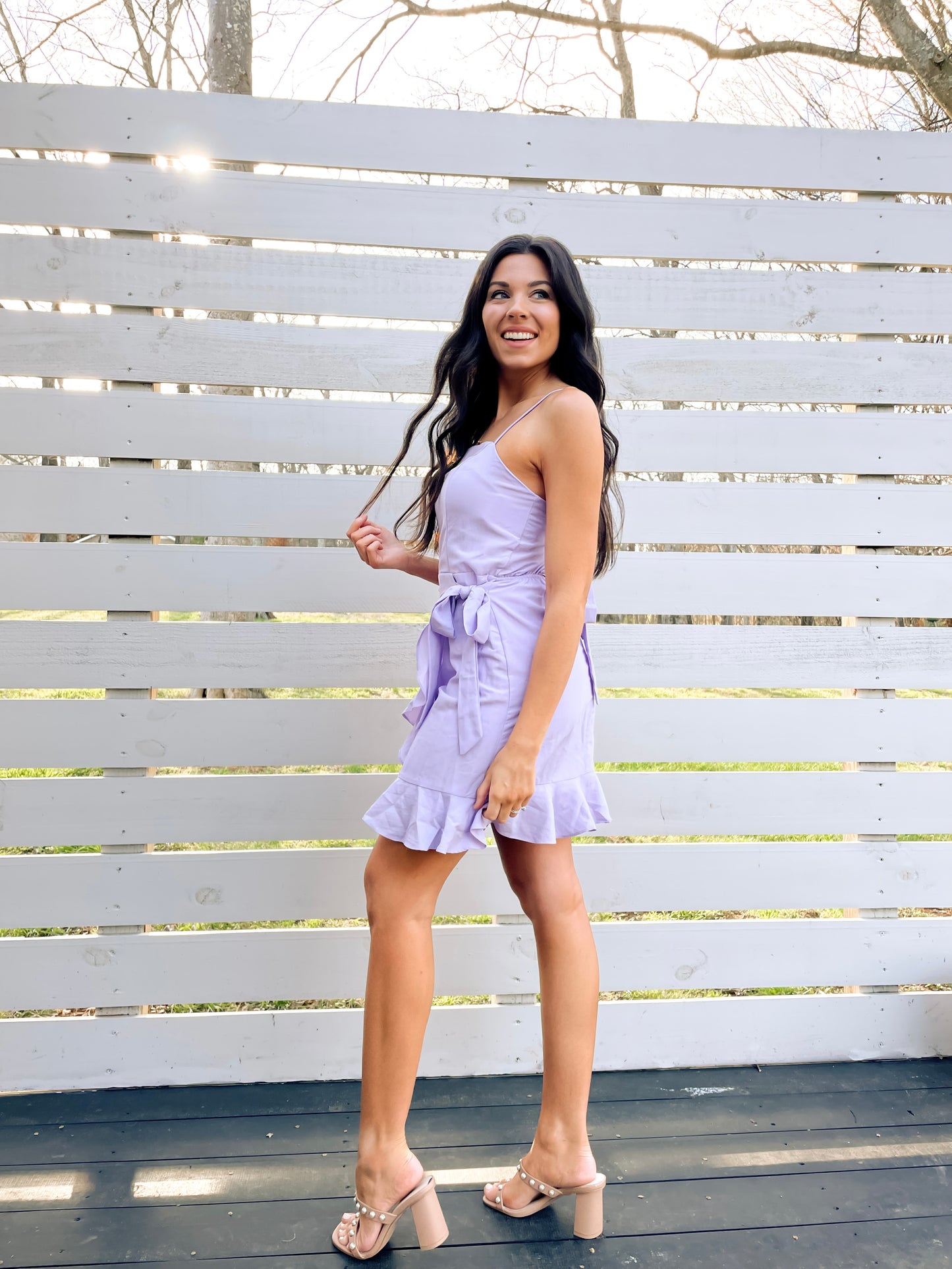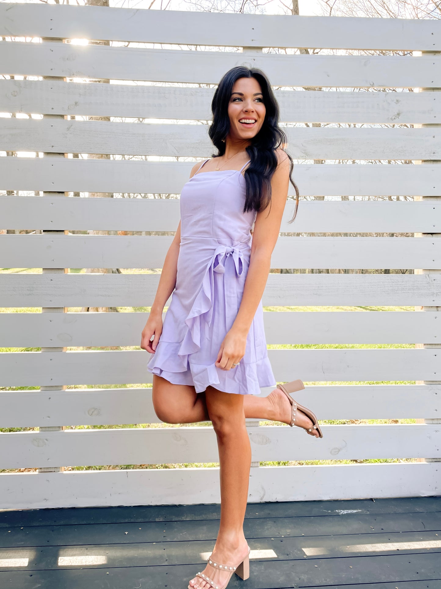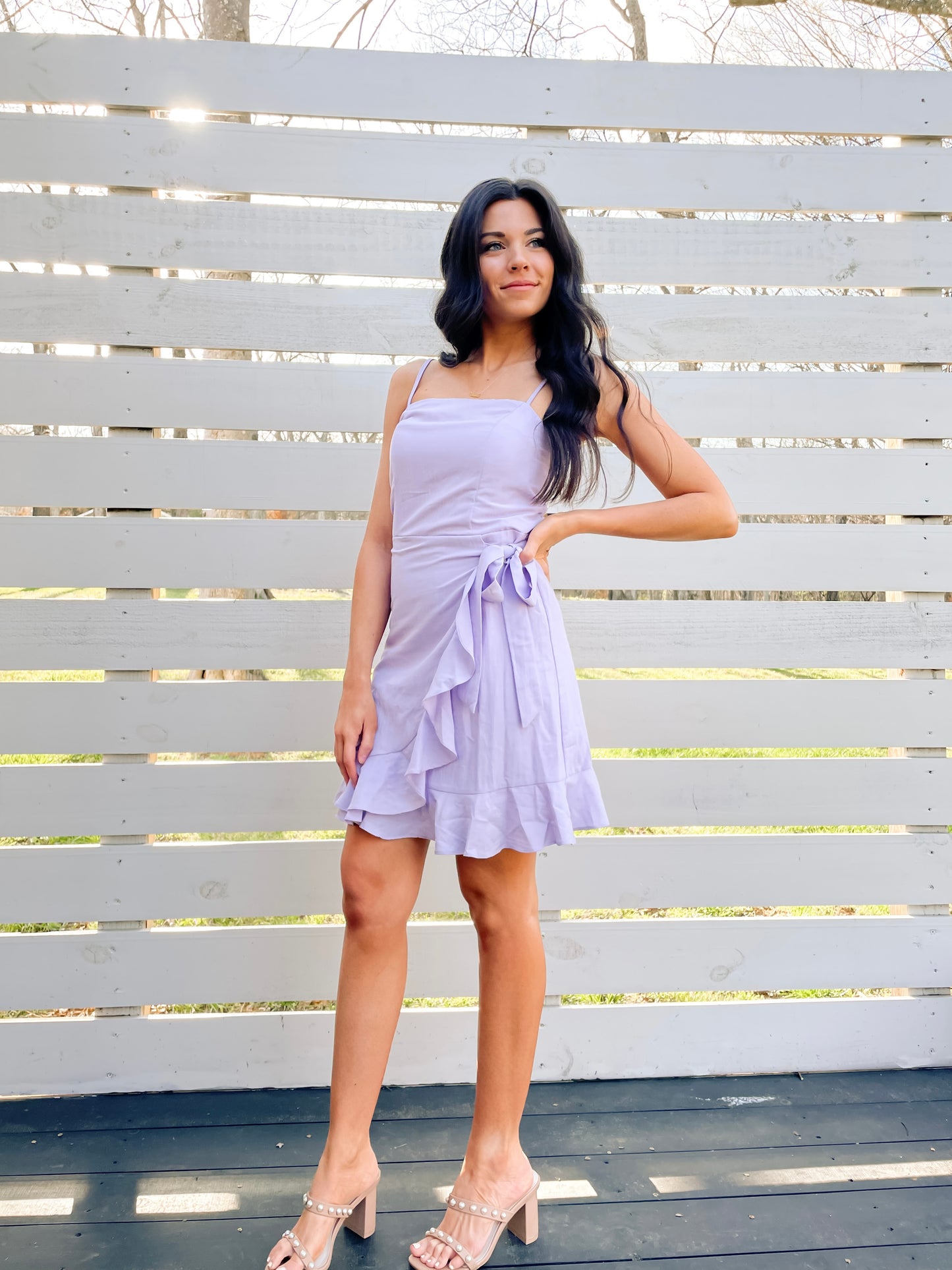 Lilac woven dress featuring adjustable spaghetti straps, ruffle detailing in the front with self tie, back zipper closure with back tie!