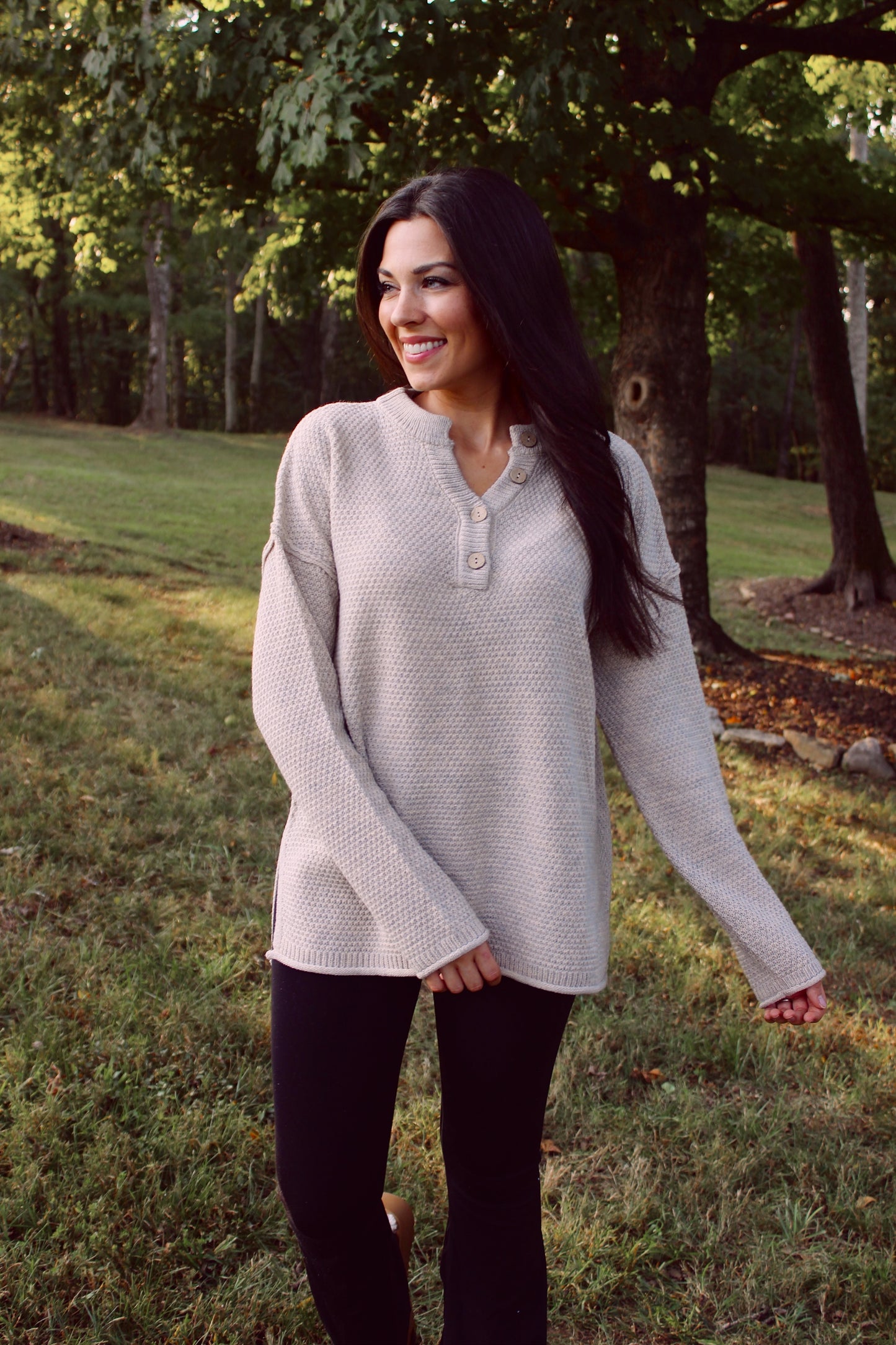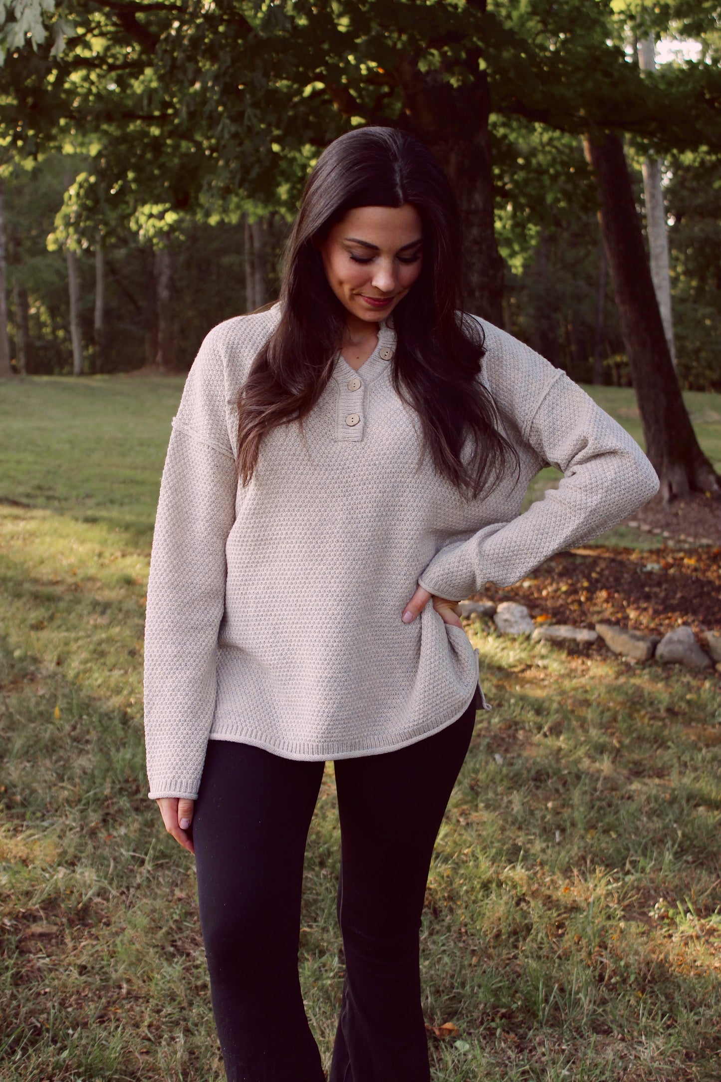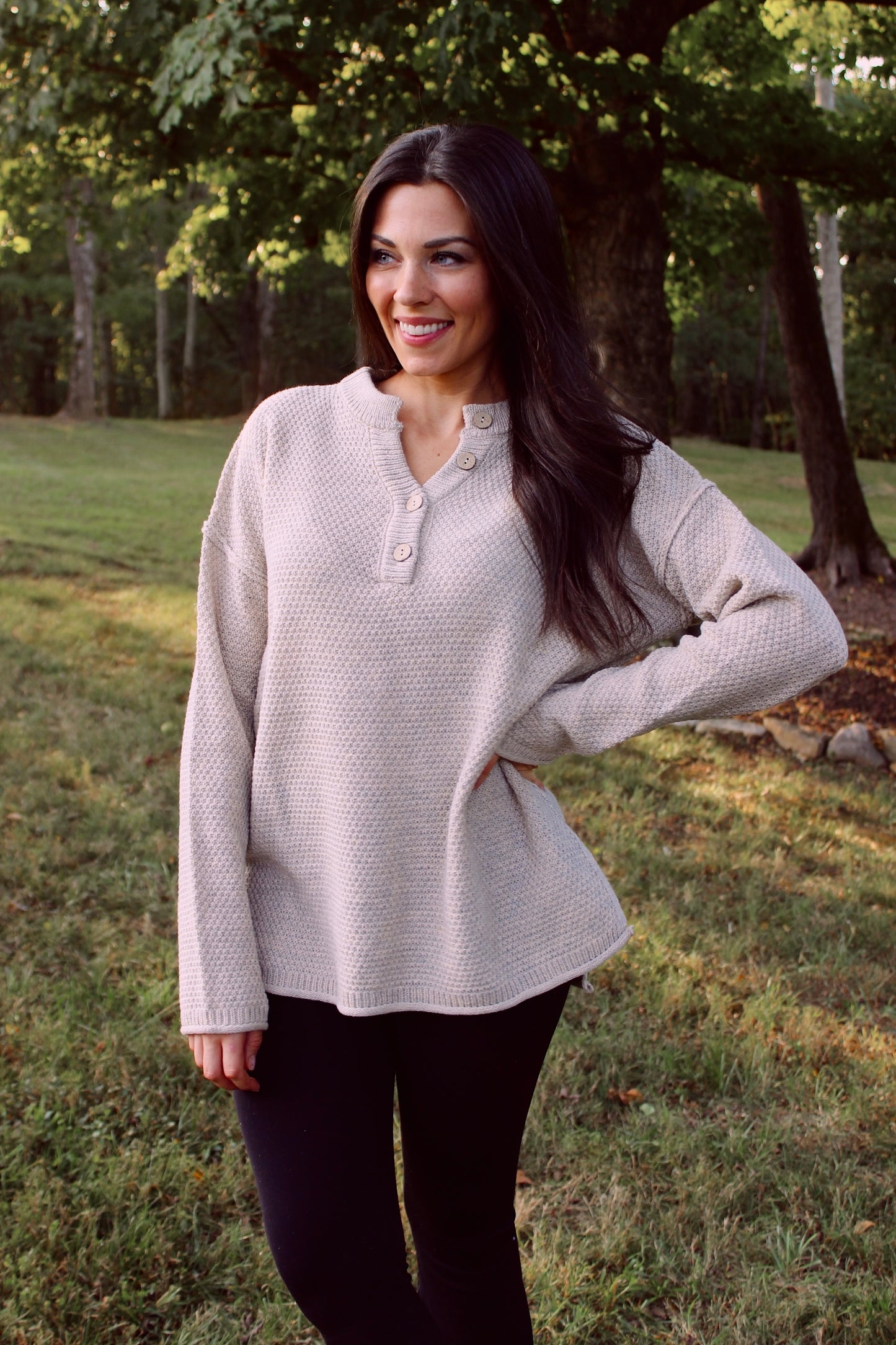 Henley Button Up Sweater - Beige