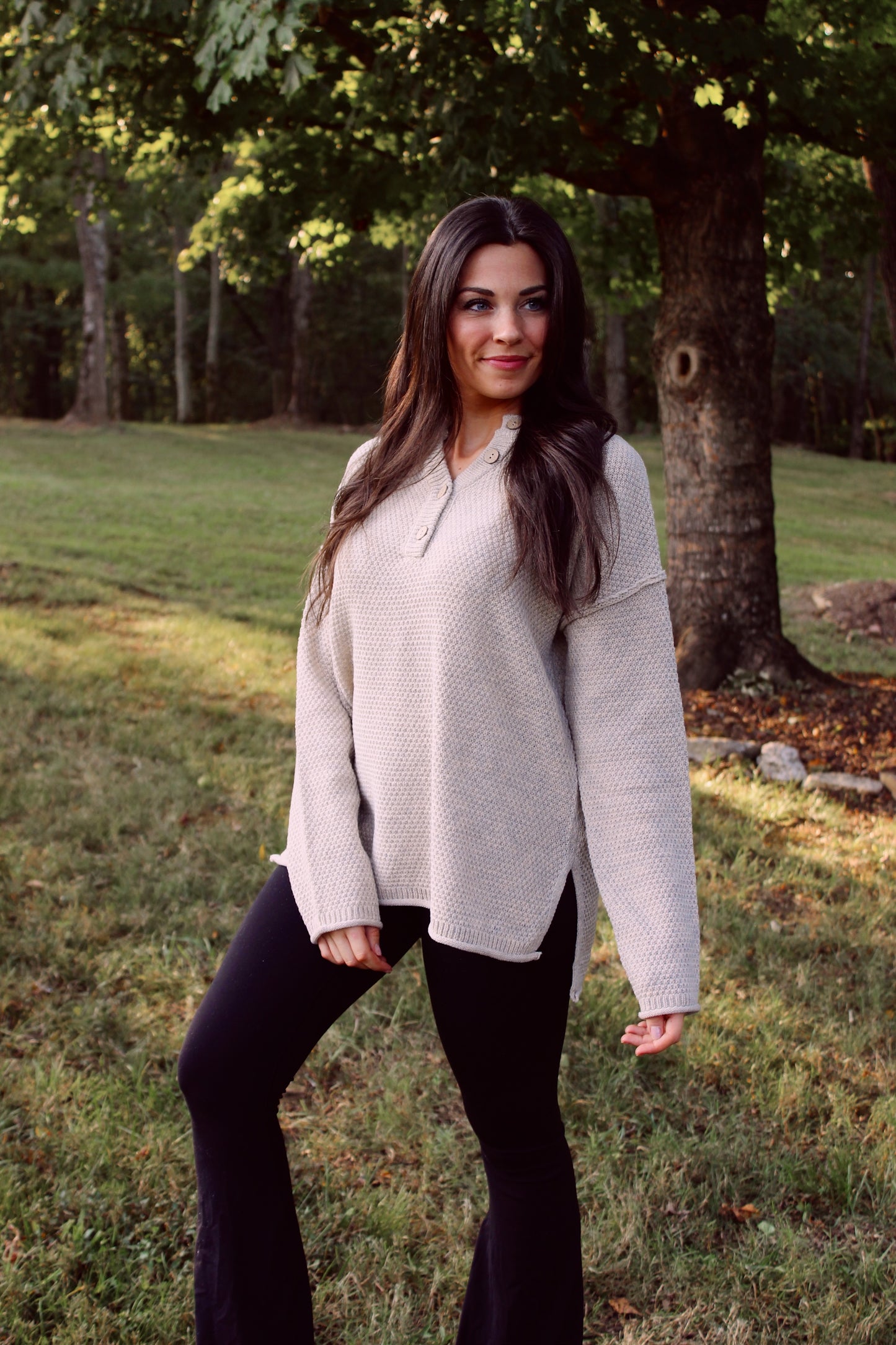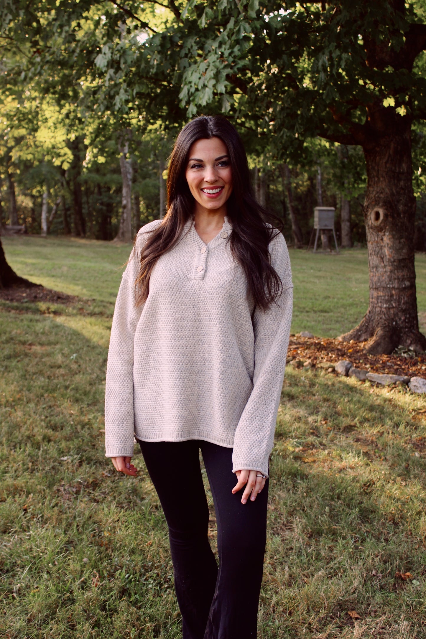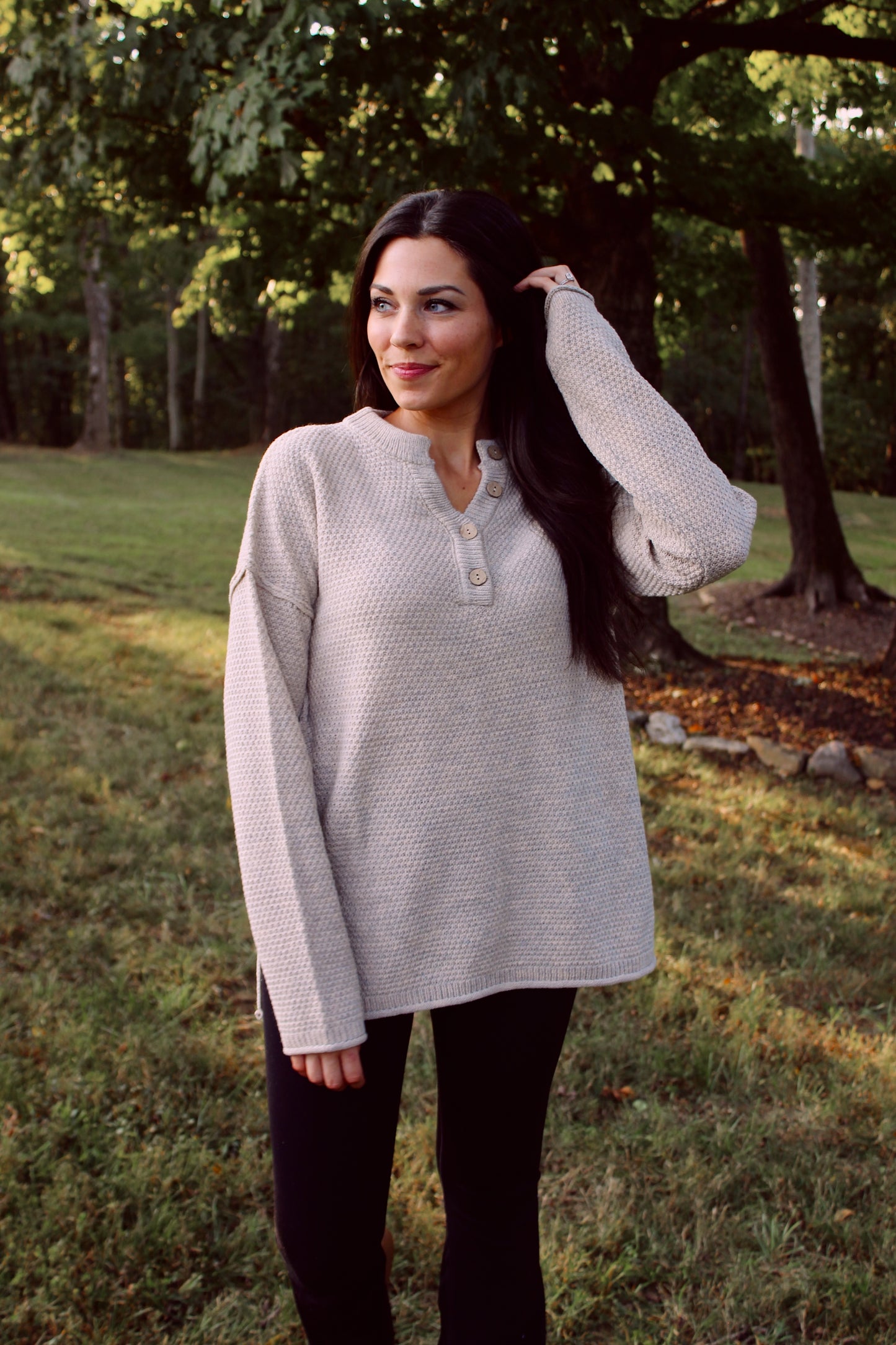 Henley Button Up Sweater - Beige